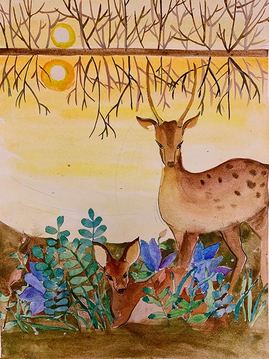 寓意:此畫旨在倡導(dǎo)人與自然和諧發(fā)展、和諧共生、保護動物、保護生物多樣性。小作者用自己手中的畫筆將心中對小鹿的喜愛,對動物生命的崇敬,描繪了夕陽下綠草叢蔭中兩只麋鹿安詳?shù)臈⒌氐奈喇嬅妗Mㄟ^鹿的棲息地體會到小作者內(nèi)心的溫暖,用畫作來感悟生命,以藝術(shù)呵護生命,以真情來倡議大家保護動物,參與到生命共同體的保護行列中。