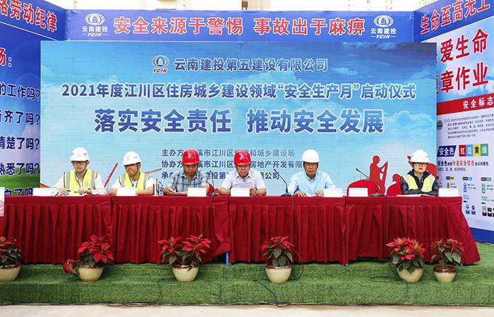 6月15日, 由玉溪市江川區(qū)住房和城鄉(xiāng)建設(shè)局主辦、玉溪市江川區(qū)興民房地產(chǎn)開發(fā)有限公司協(xié)辦,云南建投第五建設(shè)有限公司五〇一直管部承辦的江川區(qū)住房城鄉(xiāng)建設(shè)領(lǐng)域“安全生產(chǎn)月”啟動儀式在書香苑二期項目舉行。玉溪市江川區(qū)住建局局長李竹貴、玉溪市江川區(qū)興民房地產(chǎn)開發(fā)有限公司經(jīng)理張文祥出席本次活動。參加本次活動的還有江川區(qū)住建局、質(zhì)安站等單位,以及江川區(qū)同行業(yè)企業(yè)的代表共計100人。
