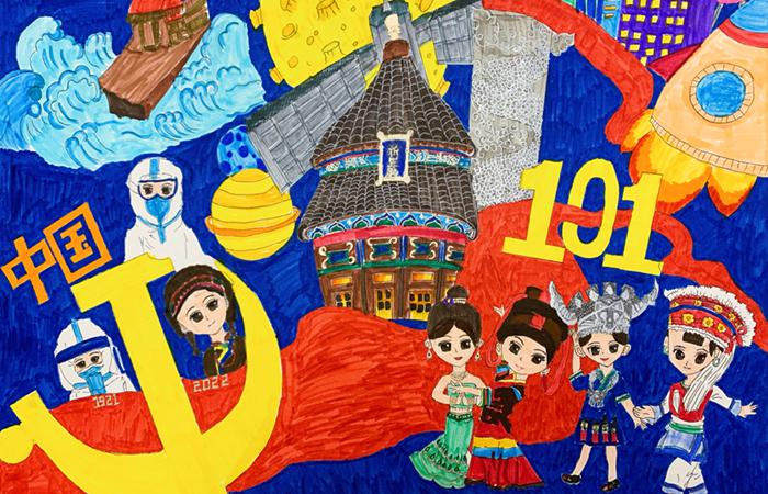 寓意:此畫旨在倡導(dǎo)我們要從小“知黨恩、聽黨話、跟黨走”,自覺踐行社會(huì)主義核心價(jià)值觀,弘揚(yáng)“紅船精神”,為實(shí)現(xiàn)中華民族偉大復(fù)興的中國(guó)夢(mèng)而努力奮斗。小作者用自己手中的畫筆將心中對(duì)祖國(guó)的熱愛與崇敬,對(duì)黨的信仰,通過繪畫Q版的少數(shù)民族來表達(dá)56個(gè)民族一家親,表達(dá)中國(guó)人民的團(tuán)結(jié)奮進(jìn),還有我們的抗疫英雄,北京的歷史宮殿祈年殿來表達(dá)我們偉大祖國(guó)的歷史文化底蘊(yùn),通過繪畫現(xiàn)代高樓、月球、火箭等表達(dá)祖國(guó)現(xiàn)今的飛速發(fā)展和實(shí)力,輕輕飛舞的紅絲帶、黨徽、紅船,沉甸甸的展現(xiàn)出我們的百年大黨,提醒我們不忘初心 砥礪奮進(jìn)。通過“喜迎二十大、永遠(yuǎn)跟黨走、奮進(jìn)新征程、爭(zhēng)做好少年”,體會(huì)到小作者愛國(guó)愛黨愛社會(huì)主義,胸懷祖國(guó),爭(zhēng)當(dāng)好少年,最美的信仰在心中。用畫作來感悟偉大祖國(guó)的巨變,為生為中國(guó)人而感到驕傲和自豪,傳達(dá)愛國(guó)情懷。