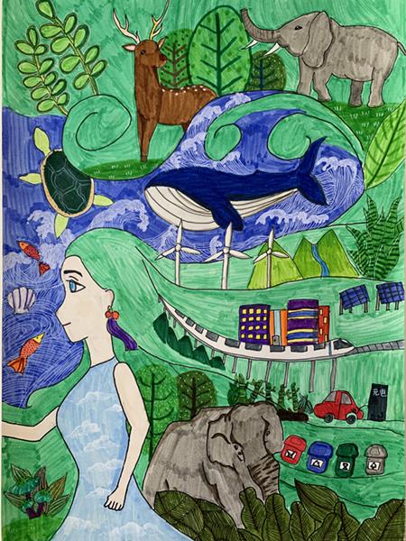 寓意:春姑娘披著一頭翠綠的長發(fā)緩緩地朝我們走來了。輕柔的暖風(fēng)送來鳥兒的歡歌。各種新嫩枝葉都敞開了胸懷,有翠綠的,嫩綠的,深綠的,一起享受著這從密葉林間穿透而過的初夏的陽光。在這綠茵茵的發(fā)絲上風(fēng)車隨意的轉(zhuǎn)動(dòng)著一圈又一圈,青山綠草在春姑娘翠綠的發(fā)絲中探了出來,城市的新地、高樓、高鐵、充電節(jié)能小汽車、還有風(fēng)力發(fā)電……一片欣欣向榮的景象沐浴著生活的陽光,在飄逸長發(fā)中搖曳。春姑娘那溫柔美好的眼神,甜甜的微笑,還有細(xì)微的眉頭,都能讓人感受到生命的美好,各種小動(dòng)物、植物也都隨著他們的腳步在春光中醒來,展示著生命的可貴。