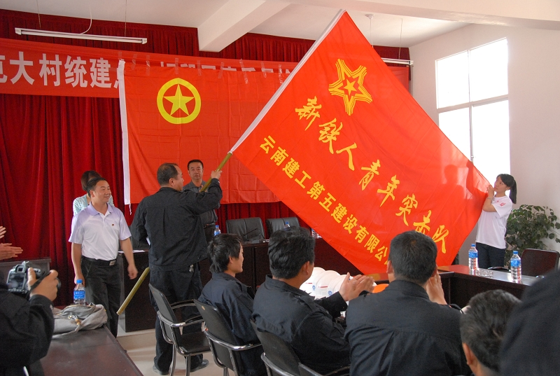 圖為集團(tuán)公司團(tuán)委副書記雷棲為項(xiàng)目部青年突擊隊(duì)授旗