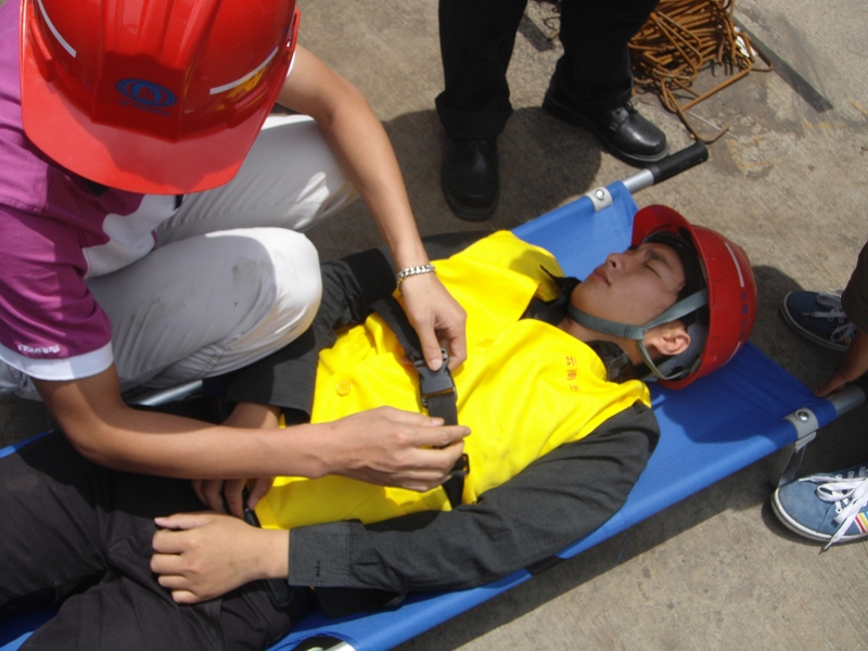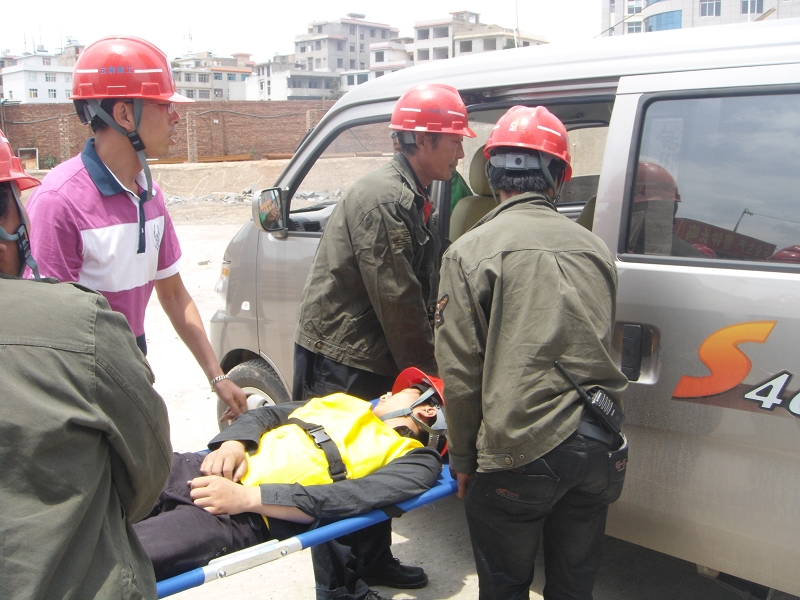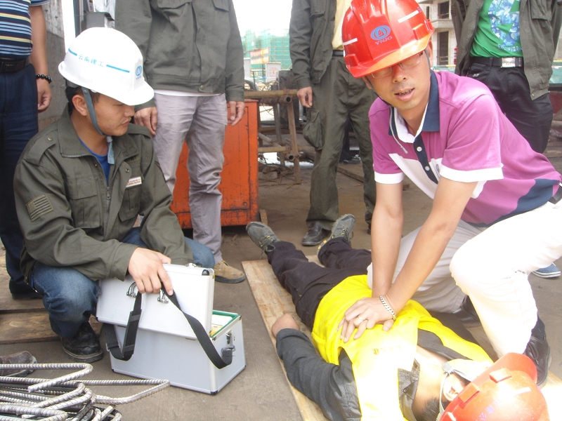 隨著現(xiàn)場(chǎng)一片寂靜,直五部潤(rùn)城項(xiàng)目部2#鋼筋場(chǎng)正在施工的一名工人模擬觸電,旁邊的工友立即用木棍隔離觸電體后,切斷電源,馬上通知項(xiàng)目部經(jīng)理,項(xiàng)目經(jīng)理宣布啟動(dòng)項(xiàng)目部應(yīng)急預(yù)案,應(yīng)急事故處理小組人員迅速趕赴現(xiàn)場(chǎng)……