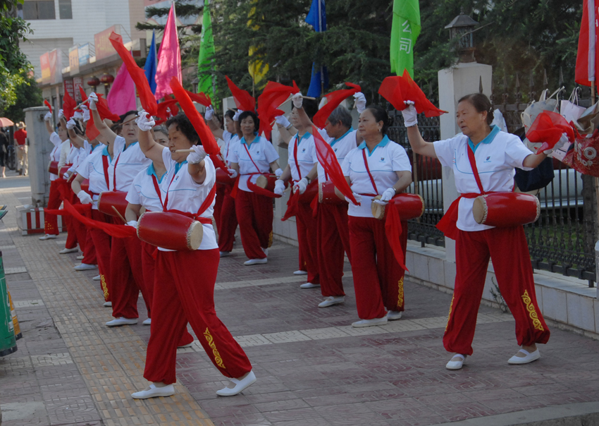 退休女工腰鼓隊激情獻藝。