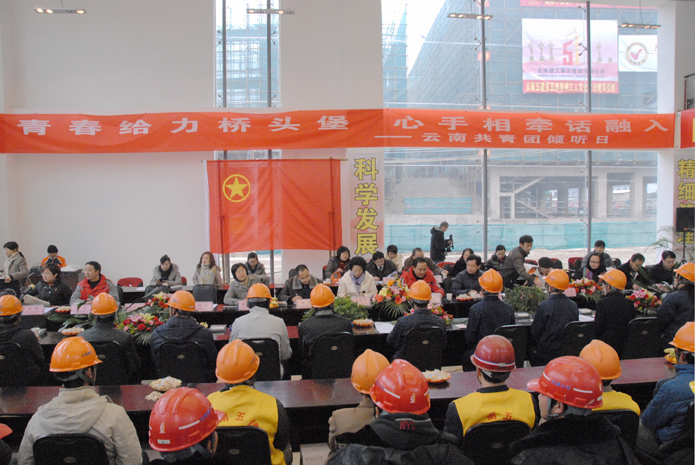技術(shù)支持: 方森科技 2011年1月16日下午,共青團(tuán)云南省委邀請部分省人大代表、省政協(xié)委員、昆明市12355青少年服務(wù)臺,青少年事務(wù)教授、專家、律師到公司承建的昆明市工人文化宮遷建項目工地開展主題為“青春給力橋頭堡 心手相牽話融入”的“云南共青團(tuán)傾聽日”活動,傾聽現(xiàn)場青年的心聲。共青團(tuán)云南省委書記、省人大常委饒南湖,集團(tuán)公司副總經(jīng)理楊濤,黨委委員、黨委工作部部長陳發(fā)強(qiáng),團(tuán)委副書記雷棲,公司副總經(jīng)理李興奎出席活動并與青年們座談。團(tuán)省委權(quán)益部部長吳琳、楊濤在座談會上發(fā)言。座談會由共青團(tuán)云南省委副書記楊金瑩主持。