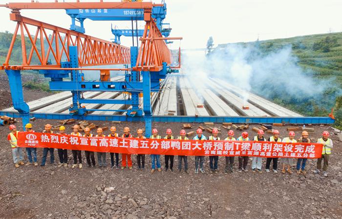 主動(dòng)想 扎實(shí)干 看效果 | 宣富高速五分部鴨團(tuán)大橋全幅20米預(yù)制T梁架設(shè)順利完成
